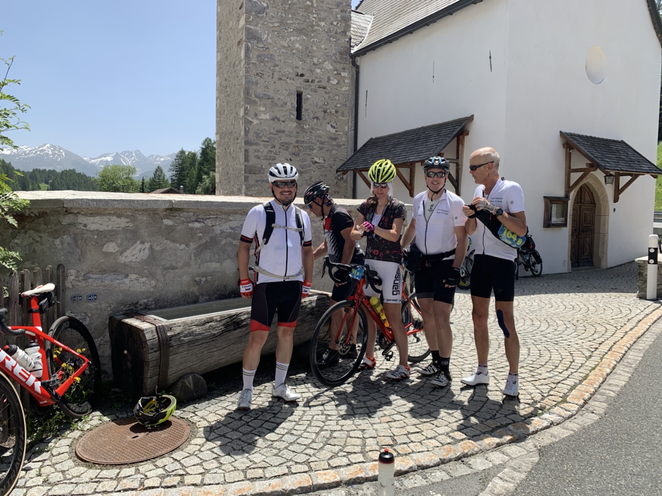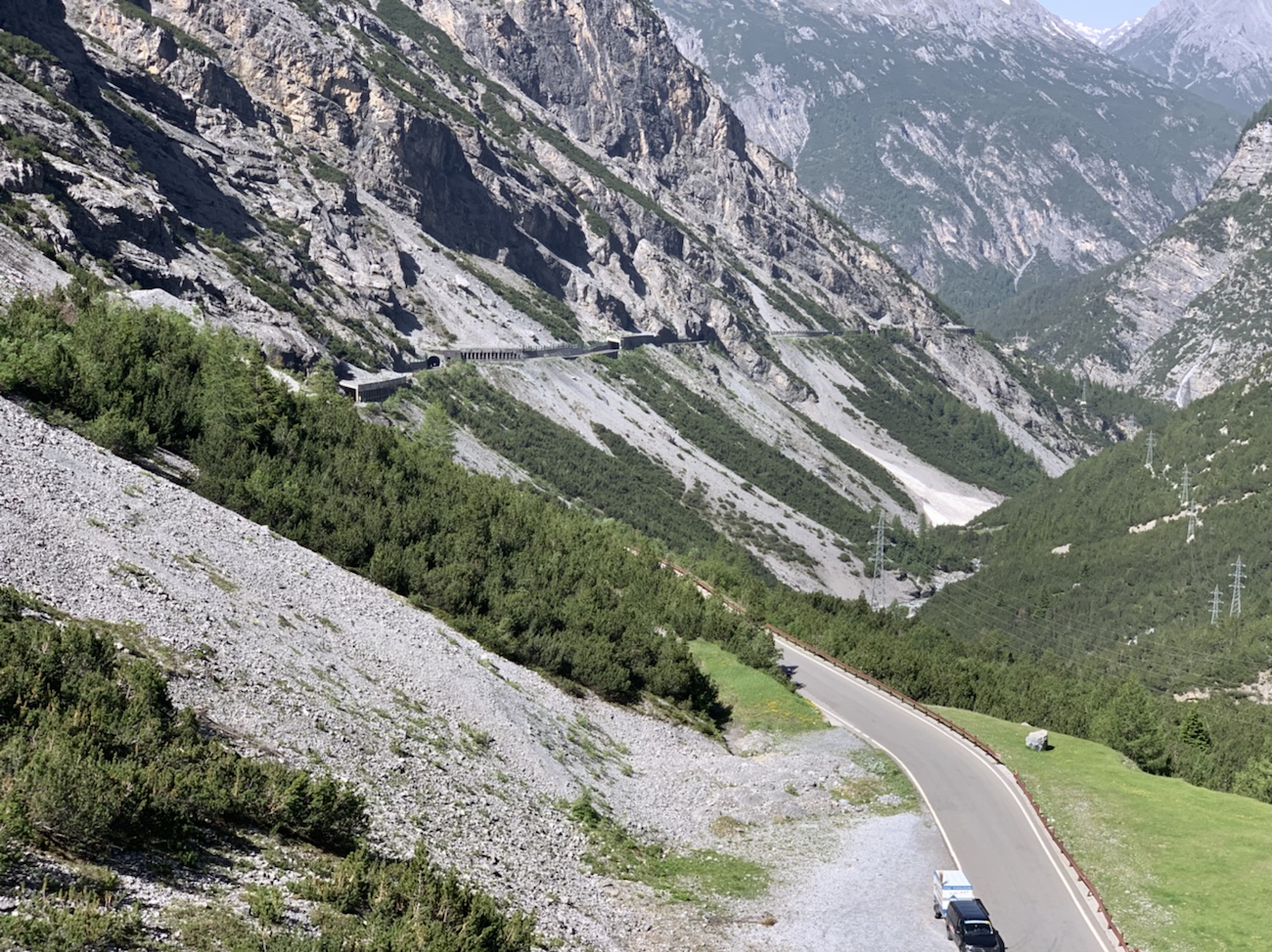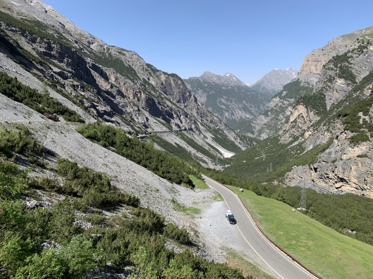 Den Ofenpass rauf gibt es für uns einen Shuttlebus, dass heißt 2,5 km im Besenwagen mit Manftred und Christian – die Engel für uns.