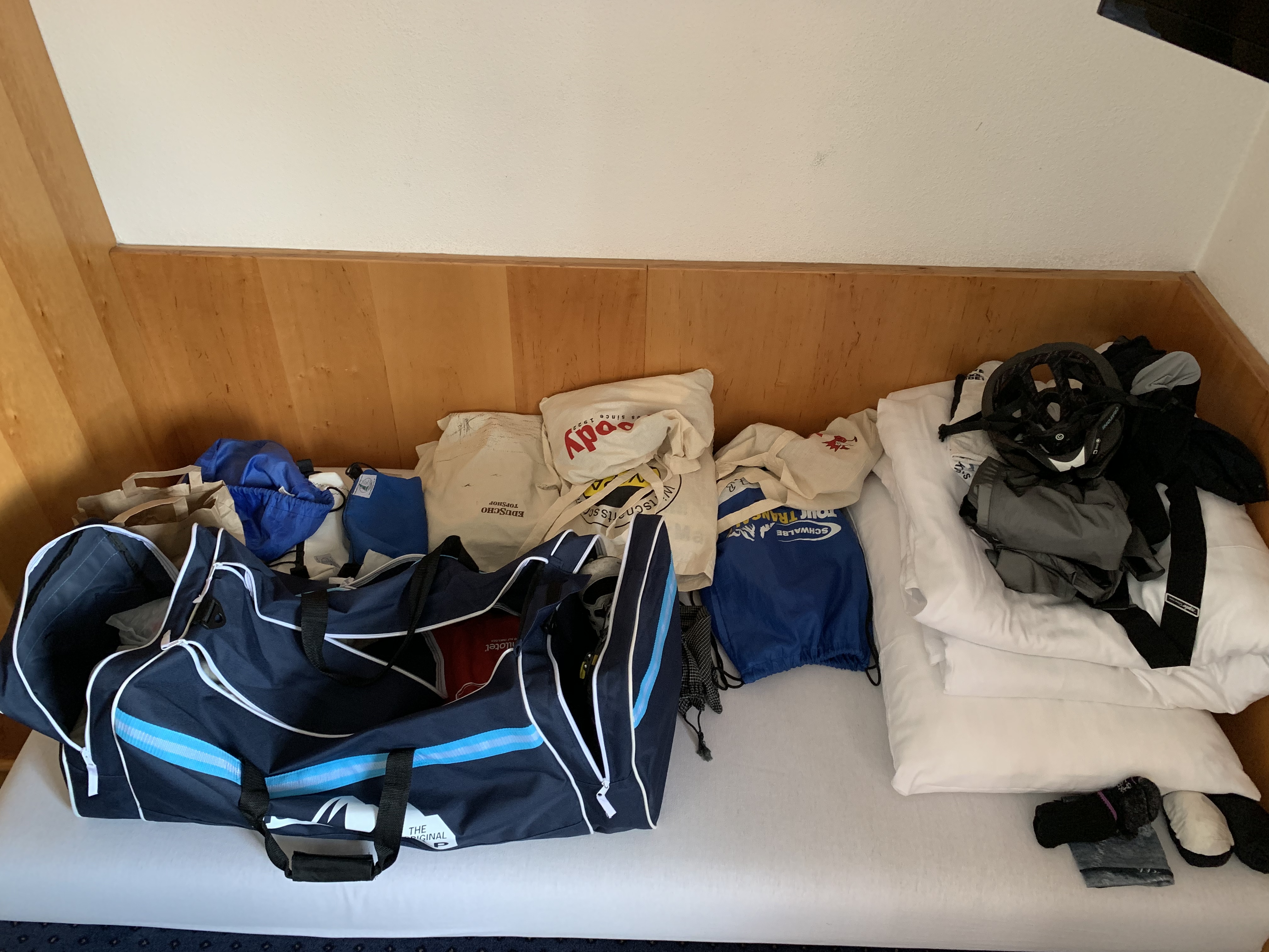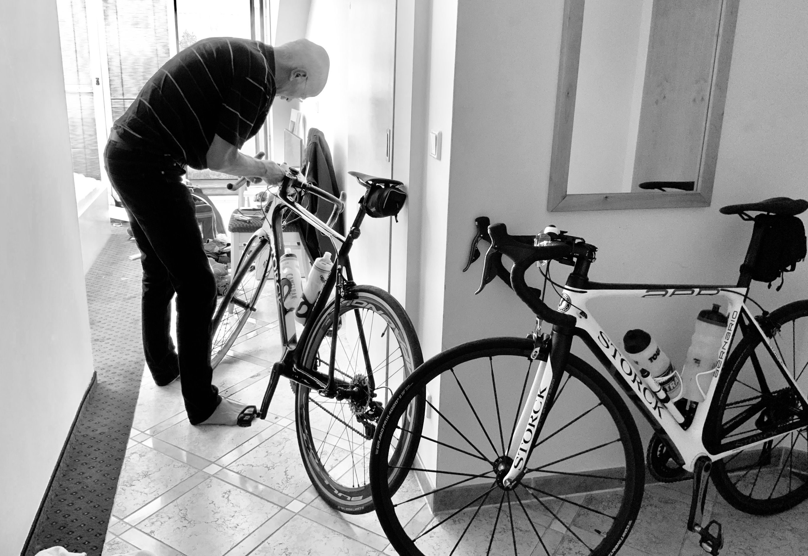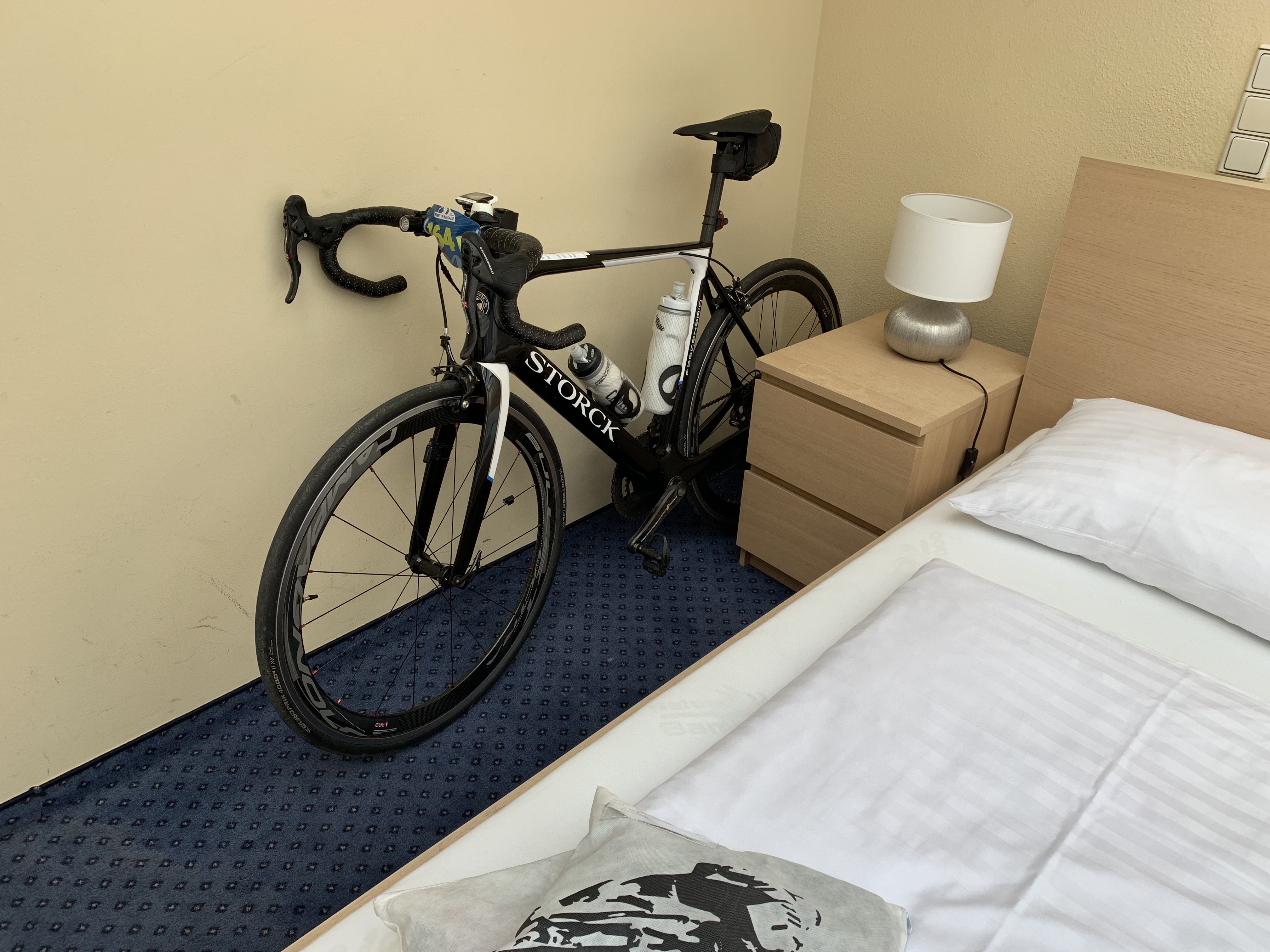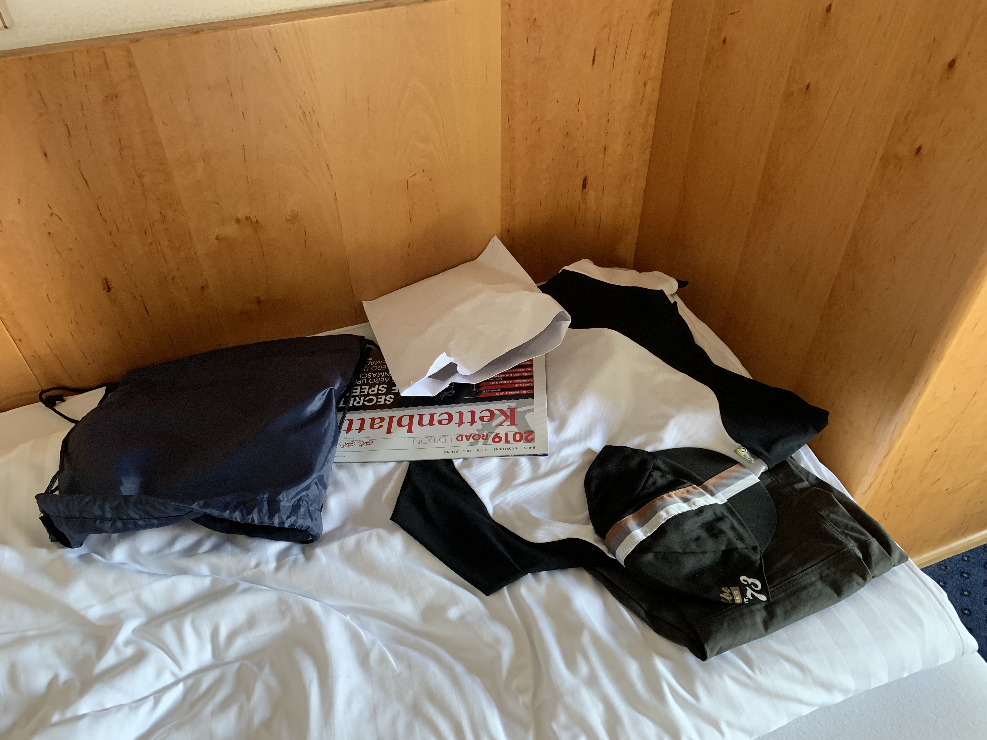 Im Hotel der übliche technische Dienst am Rad und das Packen und sortieren der Sachen: Fett auf die Kette schmeißen, Startnummern und Transponder für die Zeitmessung befestigen …