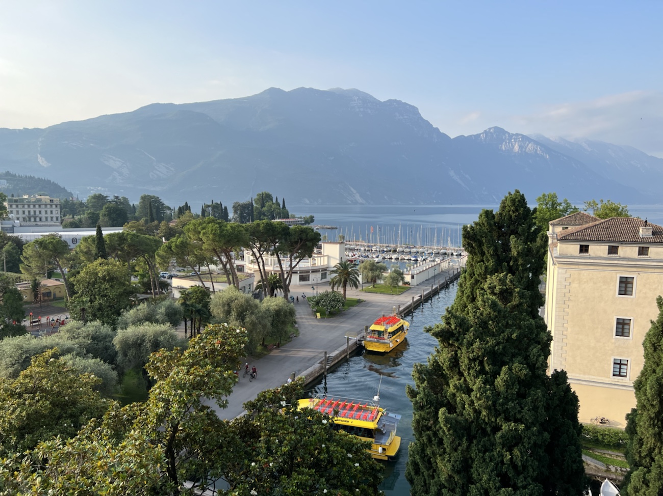 Heute früh haben wir um 7:00 in Riva del Garda gefrühstückt um zeitig zurück zum Start nach Reschen zu kommen. Wir mussten ja noch den Leihwagen in Landeck zurückgeben. Alles zusammen hat dafür gesorgt, dass wir erst um 15:00 zur Akkreditierung kommen werden.