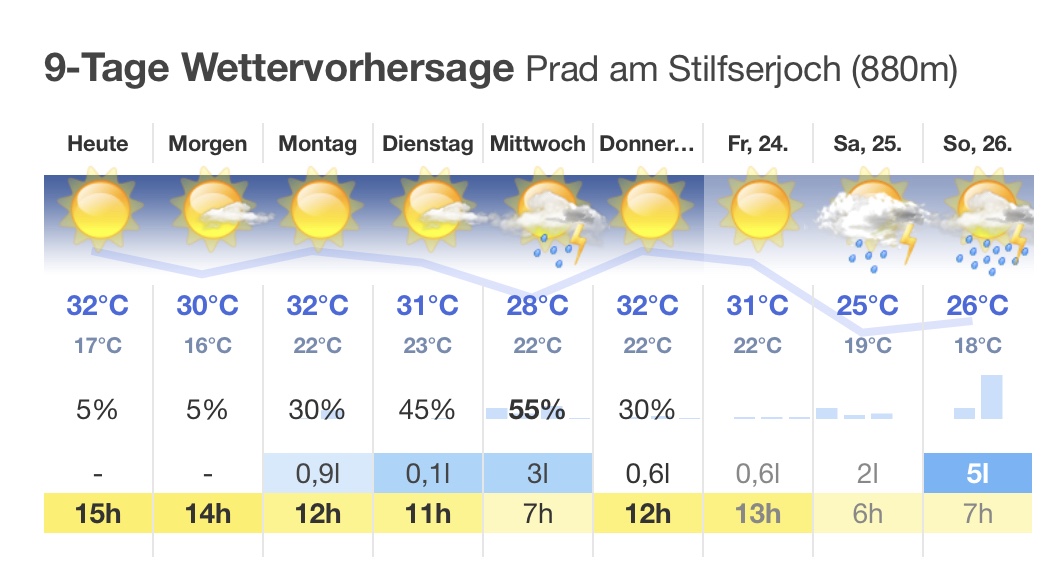 Morgen haben wir Aussicht auf eine trockene und gut warme Fahrt nach Zernez in der Schweiz. 77 km, 1.700 Höhenmeter.